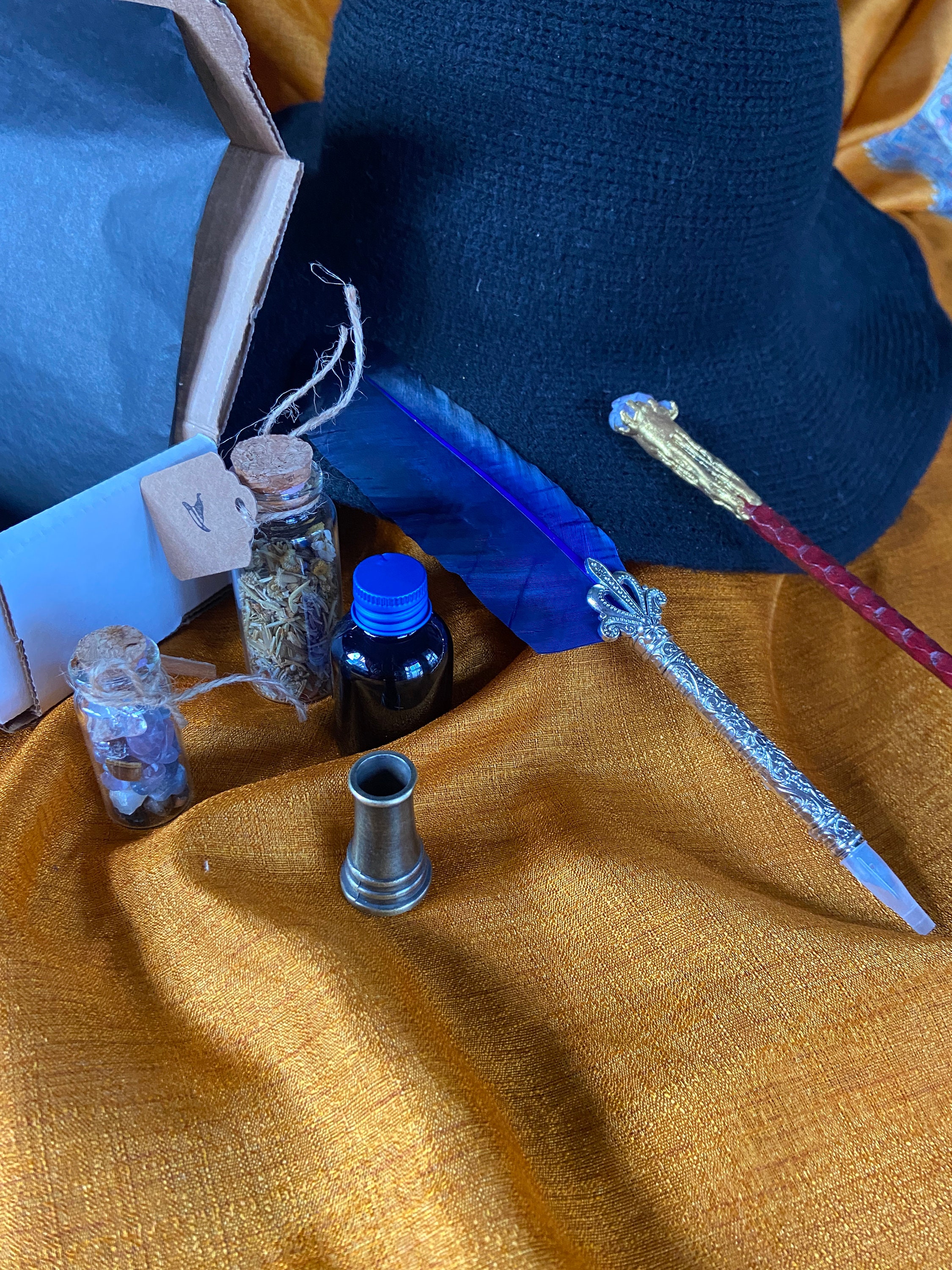 A combo of a Black Woolen Witches Hat. A Amethyst Crystal 10" Wand. A Dyed Blue Turkey Feather Ornate Quill and 5 different tips. A bottle of Blue Ink. A Brass Ink Well. A Chakra Mini Vile and a Tranquility Spell Vile.